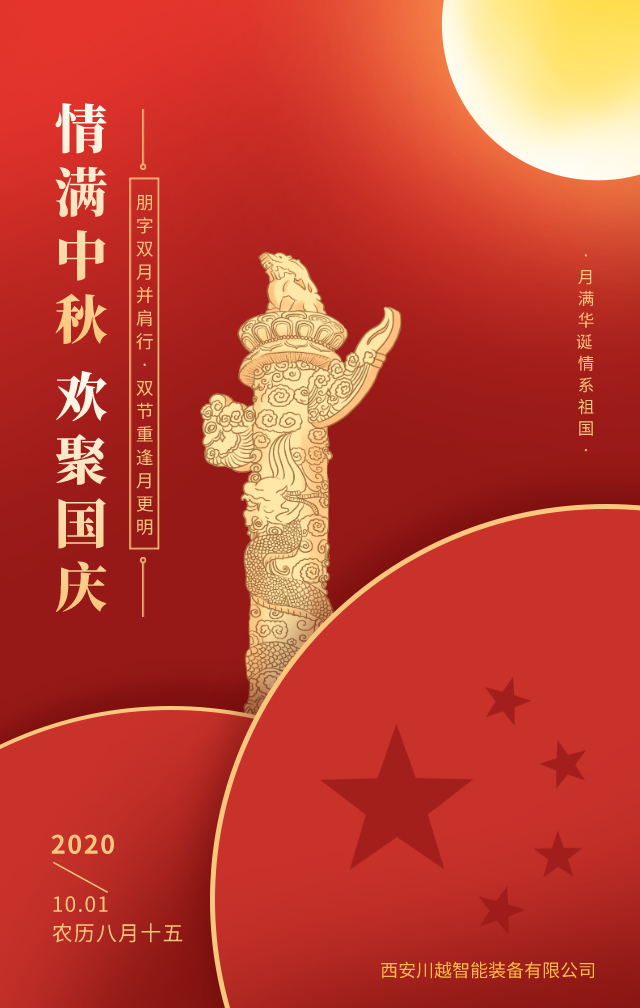 在中秋國慶雙節(jié)即將來臨之際,川越裝備提前祝您及家人節(jié)日快樂。在這普天同慶,中秋團(tuán)圓之時(shí),祝愿我們的祖國更加繁榮富強(qiáng)。