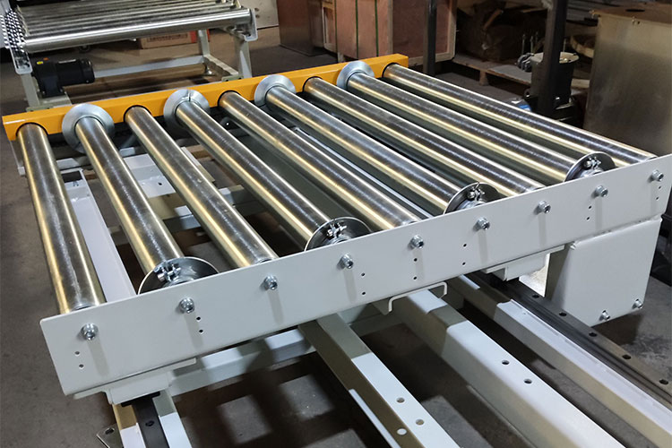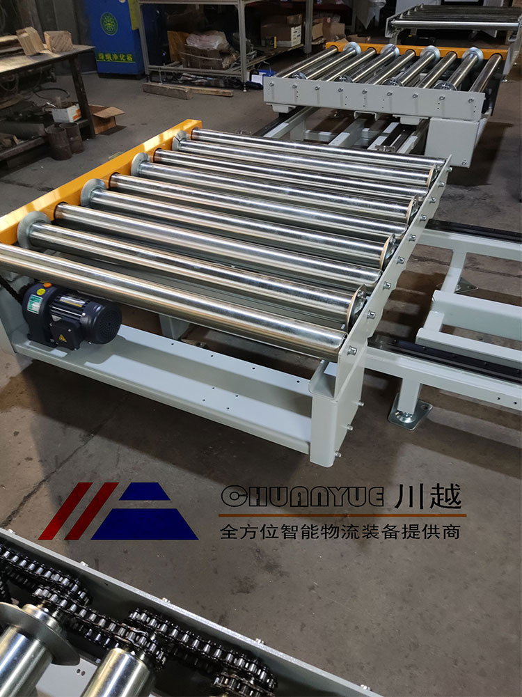 9、 水平移載車機(jī)上部為輥道輸送,下部平移采用鏈傳動(dòng)+直線軌道導(dǎo)向,端部配控制限位+機(jī)械限位;